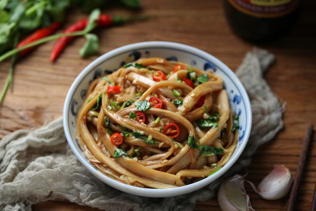 这道菜的关键就是手撕。手撕的杏鲍菇,与刀切的不同,“撕”出来的截面不平整且粗糙。这样杏鲍菇与调味汁的接触面积就会增大,更易入味,更容易挂汁,当然也就更好吃了!